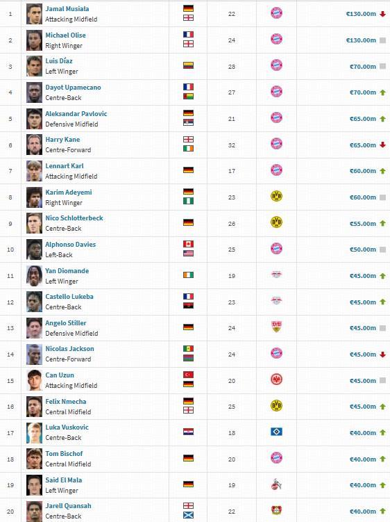在本次身价更新中,穆西亚拉身价下跌1000万欧至1.3亿欧,与奥利塞并列第一,于帕梅卡诺身价上涨1000万欧至7000万欧与迪亚斯并列第三,凯恩身价下跌1000万至6500万欧,与帕夫洛维奇并列第五,卡尔身价上涨4000万欧至6000万欧。
